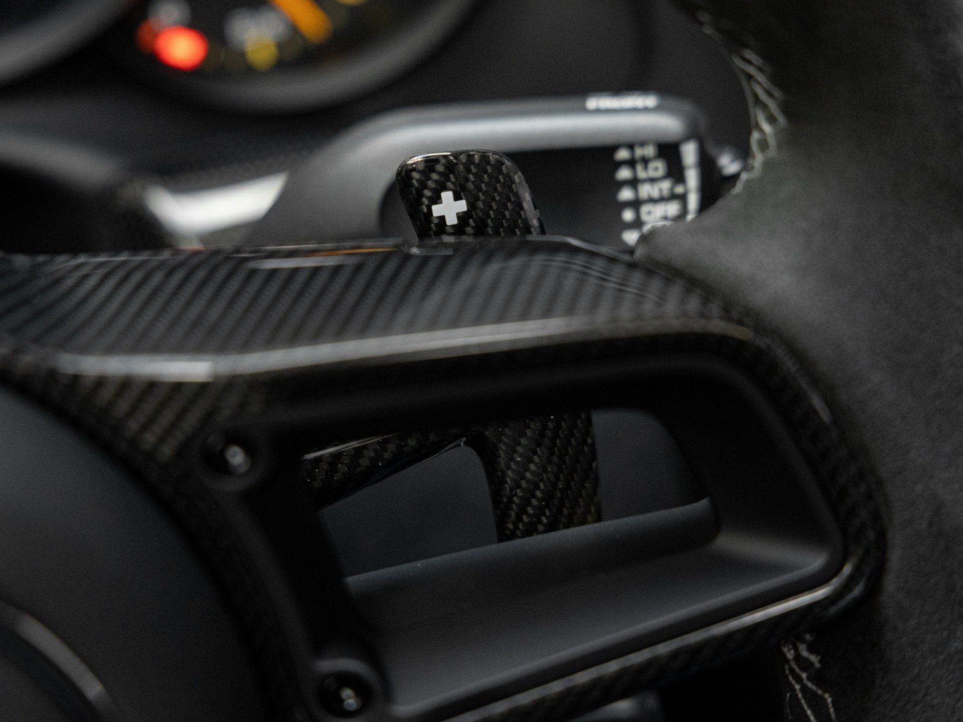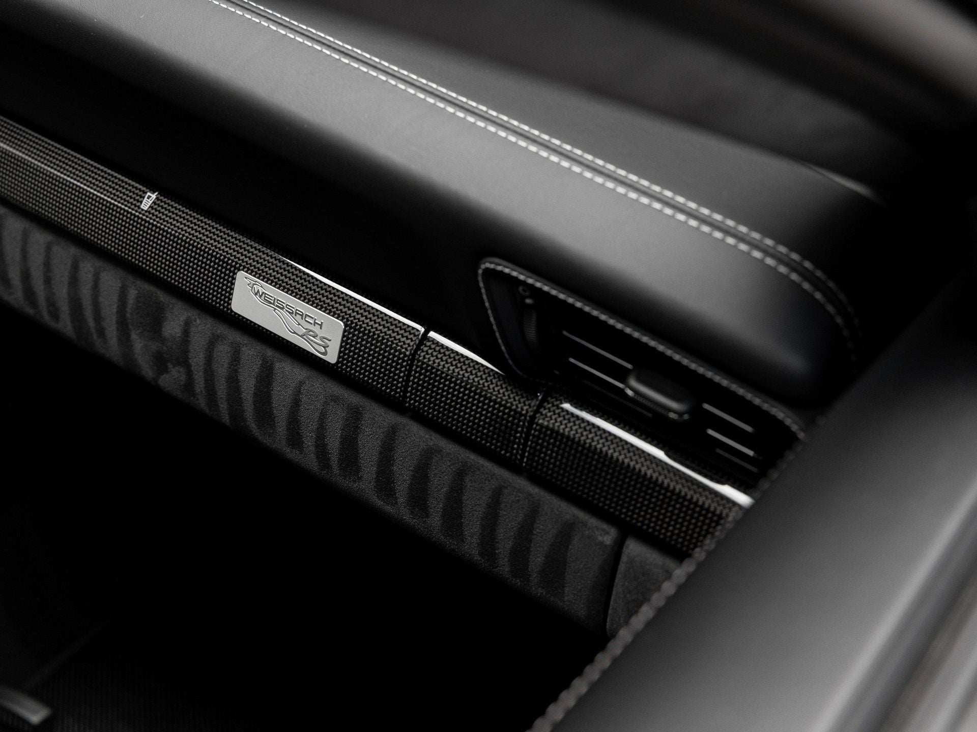 • Carbon Fiber Interior Accents: Includes carbon fiber window triangle trim, illuminated carbon fiber door sill guards, and carbon fiber floor mats with leather edging for a true race-inspired atmosphere.