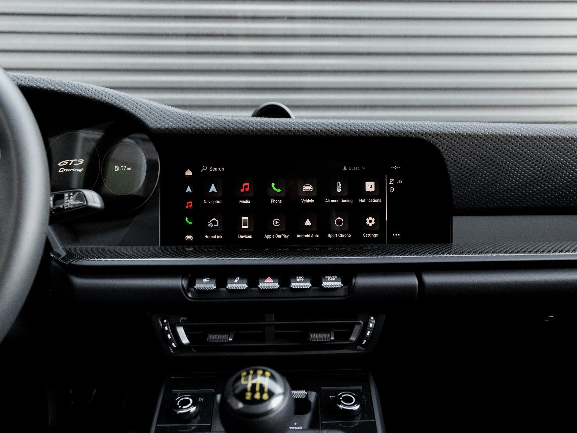The 911 GT3 Touring radiates understated performance with its Agate Grey Metallic exterior and the striking Motorsport Stripe Decal on Top in Red, complemented by the PORSCHE Logo Decal on the side in Red. A Carbon Fiber Roof and LED Headlights in Black including Porsche Dynamic Light System (PDLS) set a tone of lightweight purpose and aggressive sophistication. The Exclusive Design Fuel Cap and Under Door Puddle Light Projectors further elevate the car's attention to detail and flair.