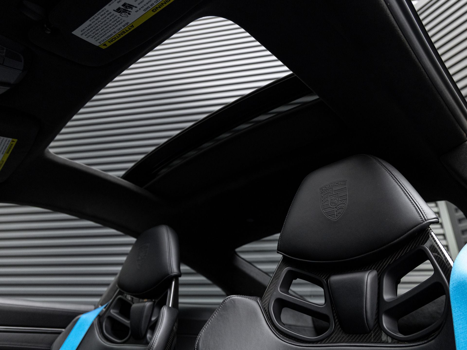 Step inside and the Black interior greets you with a focused, driver-centric environment infused with motorsport character. The Full Bucket Seats and Heated GT Sport Steering Wheel in Race-Tex with Trim in Matte Carbon Fiber emphasize performance and control, while details such as Seat Belts in Shark Blue and the Central Tachometer in Racing Yellow add striking contrast. The Roof Lining in Race-Tex, Sun Visors in Race-Tex, and Center Console Lid with Porsche Crest highlight Porsches commitment to craftsmanship, while BOSE Surround Sound System and Ambient Lighting provide comfort and refinement.
