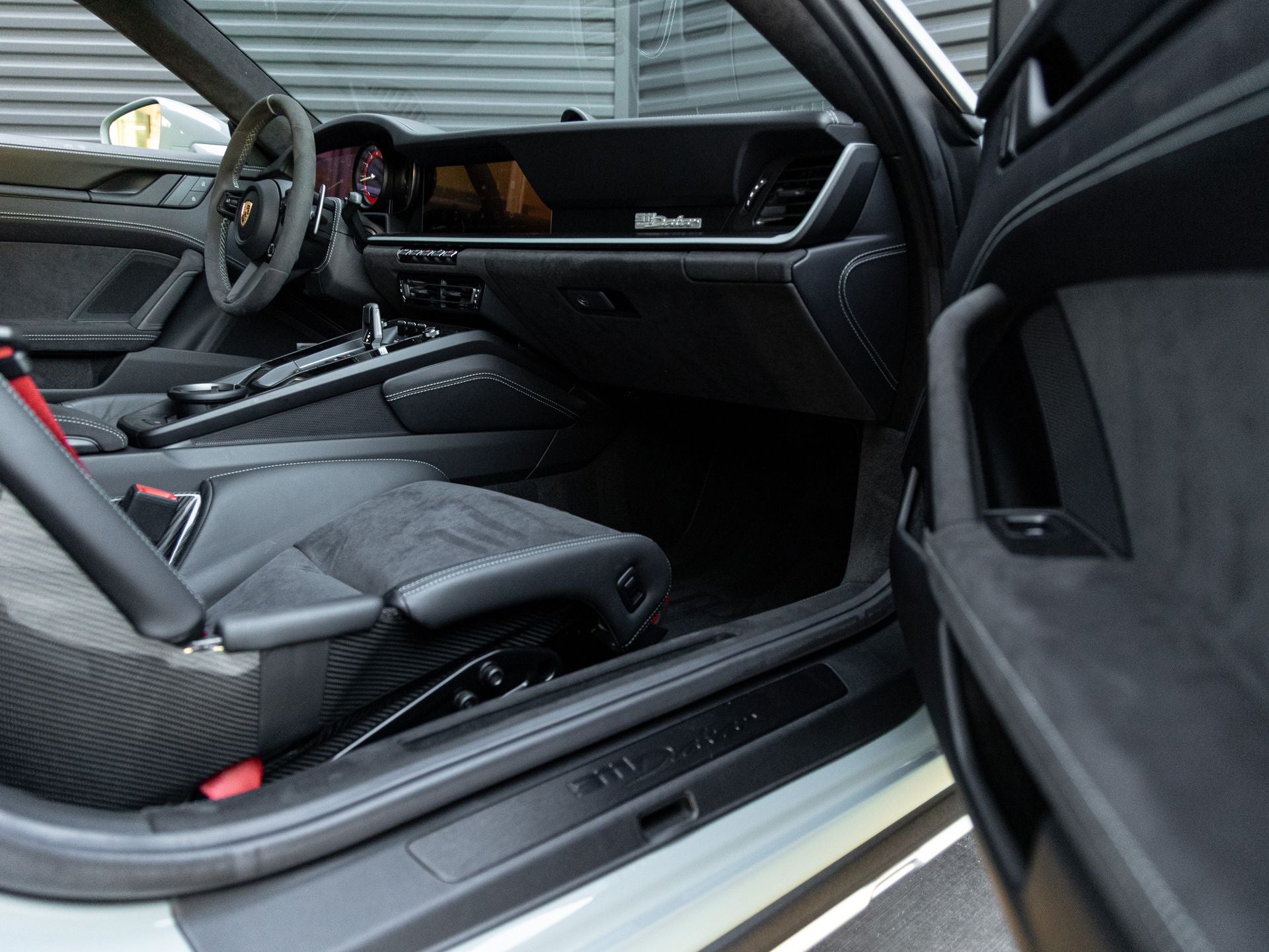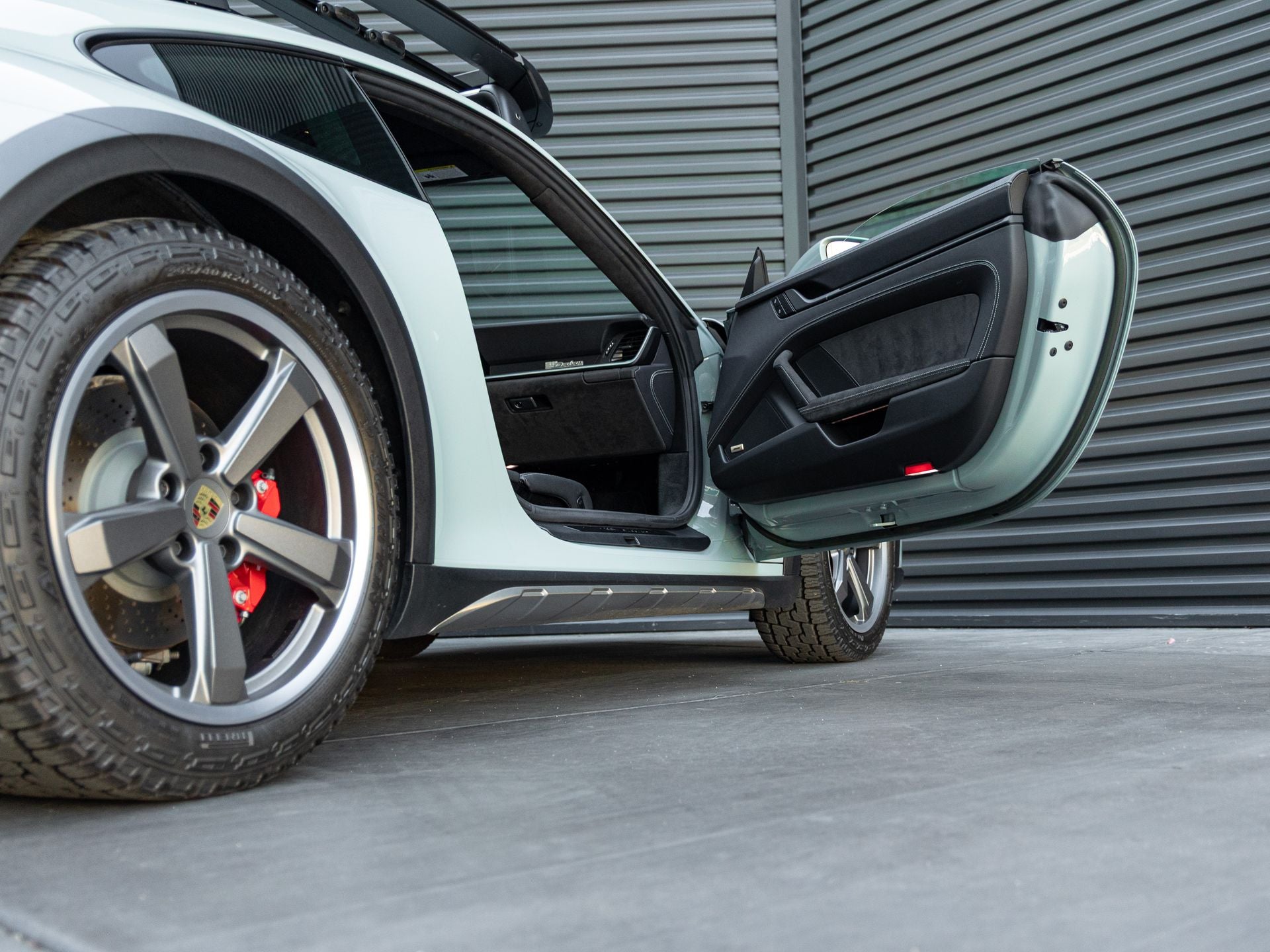 Step inside and the Black interior greets you, exuding an air of luxury that only Porsche can deliver. The Extended Race-Tex Package - Shade Green creates a bespoke environment, while Seat Belts in Guards Red and the Central Tachometer in Guards Red punctuate the cabin with unmistakable sporting flair. The Steering Column Casing in Leather adds a refined tactile touch, and the Sport Chrono Stopwatch Dial in Guards Red reinforces the driver-focused character of this exceptional 911 Dakar.